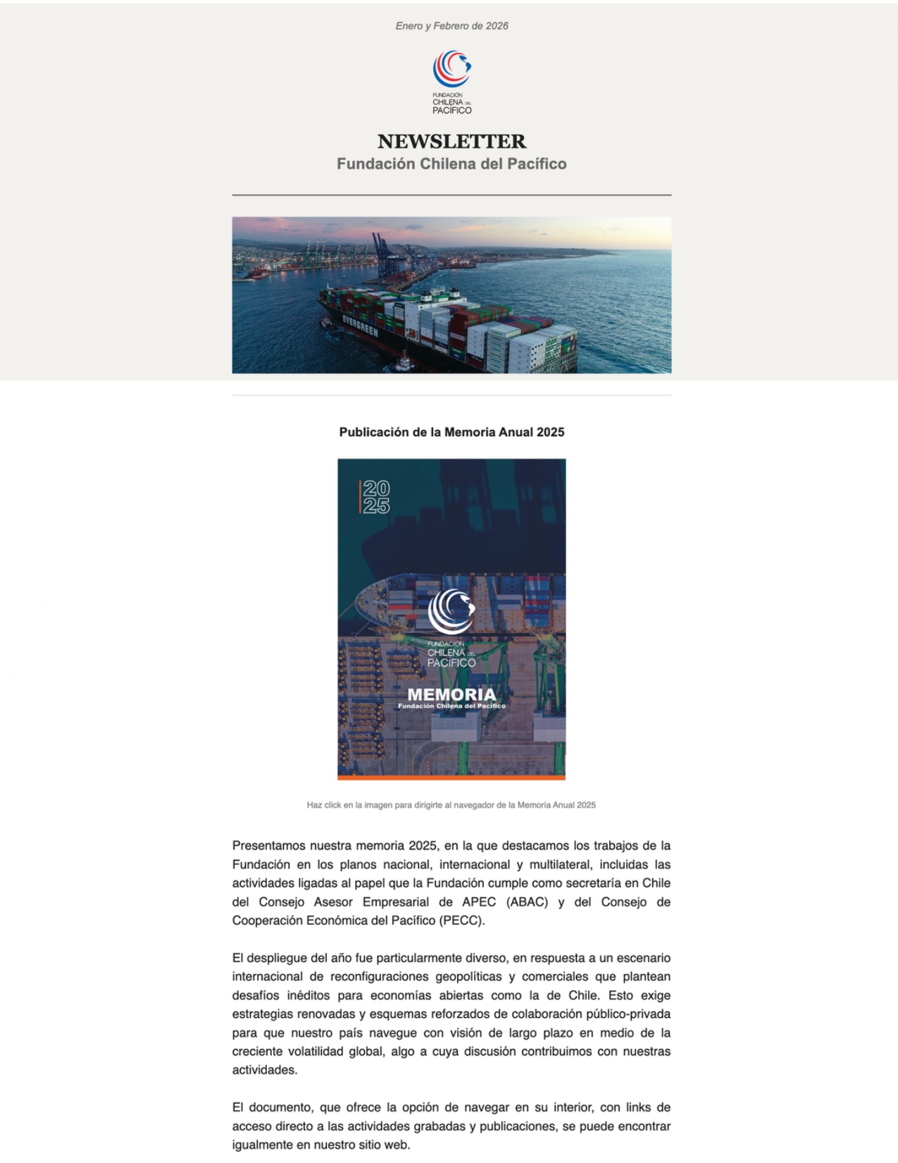 Newsletter de la Fundación Chilena del Pacífico 2026 Descarga la Auditoría 2025 Descarga el Balance General 2025 https://www.agendalogistica.cl/aranceles-asia-pacifico-comercio-exterior/chile-ante-asia-pacifico-exportar-mejor-y-atraer-inversion-estrategica/2074377