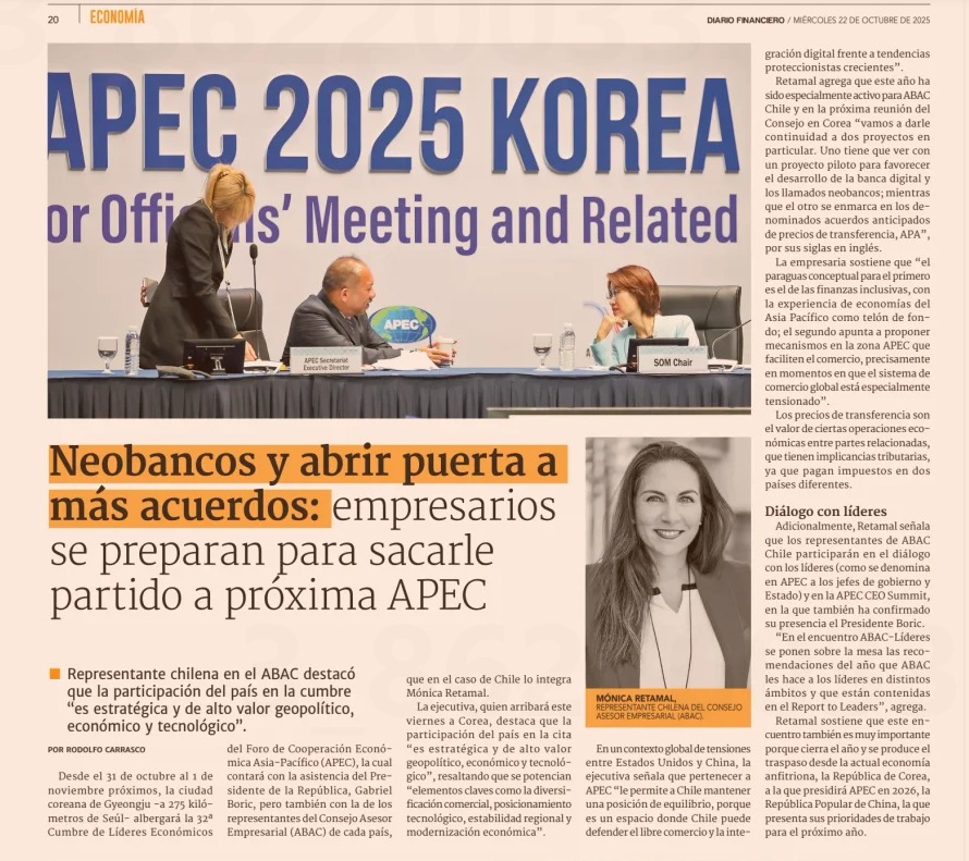 Leer másCompartimos artículo del Diario Financiero titulado «Neobancos y abrir puerta a más acuerdos: empresarios chilenos se preparan para sacarle partido a la cumbre APEC en Corea». La nota hace referencia a la próxima Cumbre APEC (entre el 29 y 31 de octubre) y al diálogo entre los Líderes de APEC y los miembros del Consejo […]